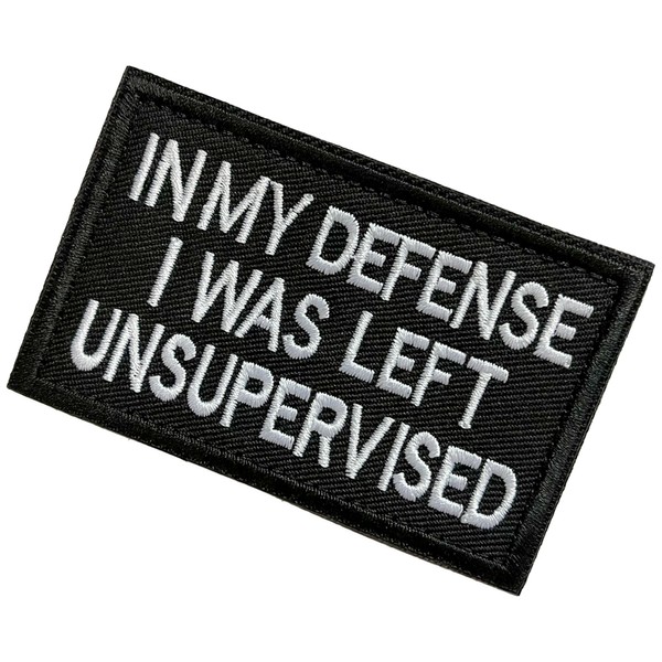 - With a clever military-inspired design, the bold embroidered text in classic military font reads "IN MY DEFENSE I WAS LEFT UNSUPERVISED"—perfect for tactical enthusiasts with a sense of humor. Crafted with fine embroidery techniques, the font is three-dimensional and plump. It is hard-wearing and resistant to thread loss or fading.