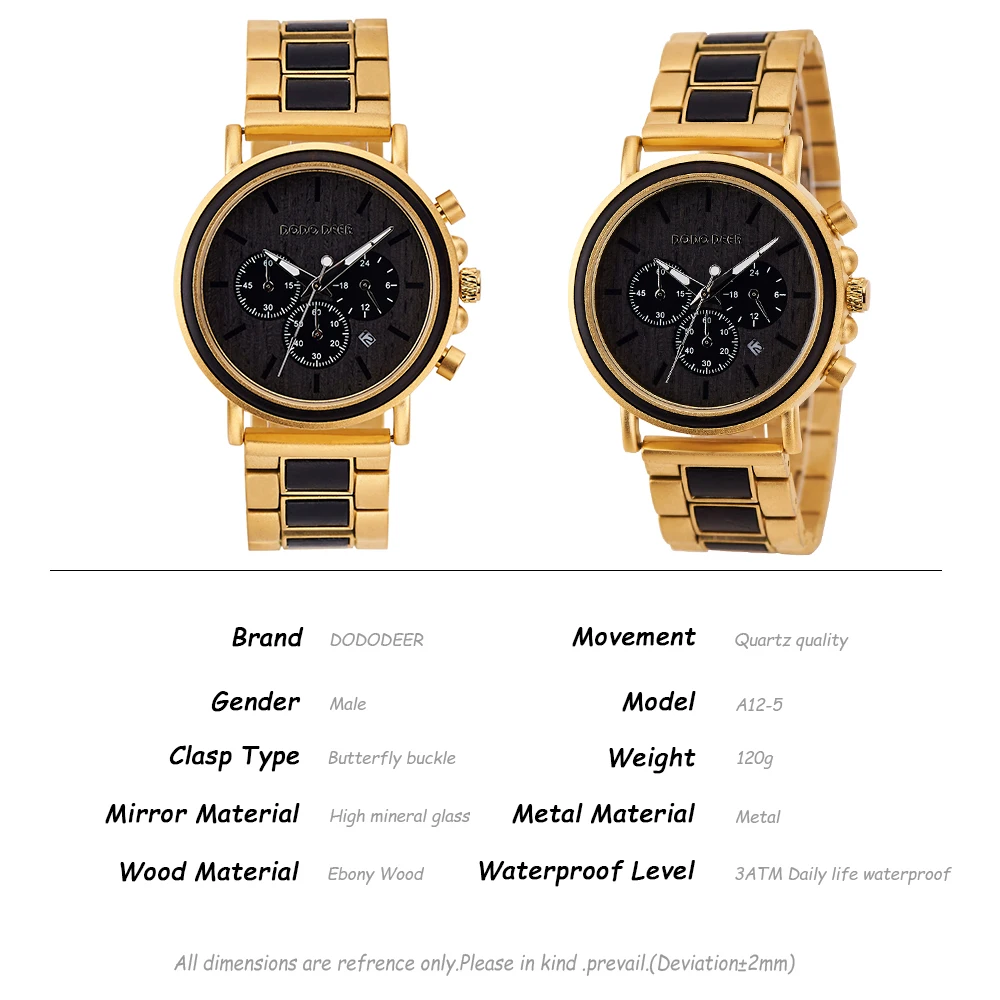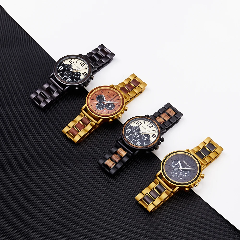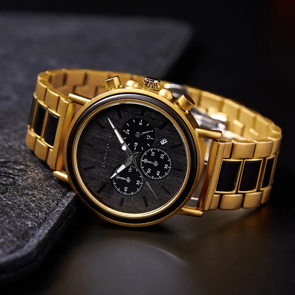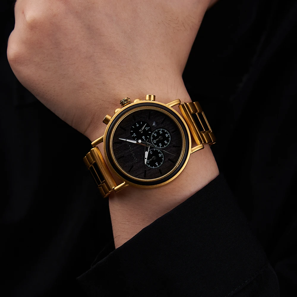 In-Stock USA Red Sandalwood & Gold Alloy Date, Stopwatch, 24H Chronograph Wood Watch with Duty-Free ShippingDesign: A12, Color: Black