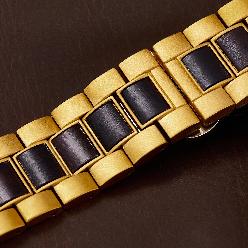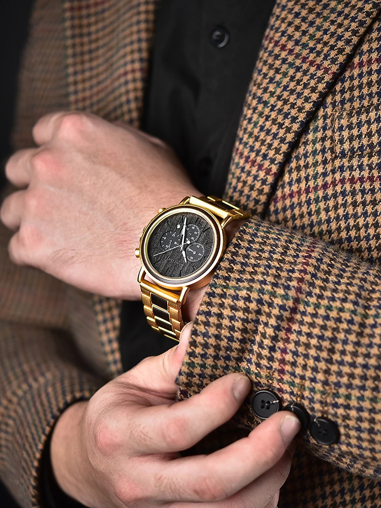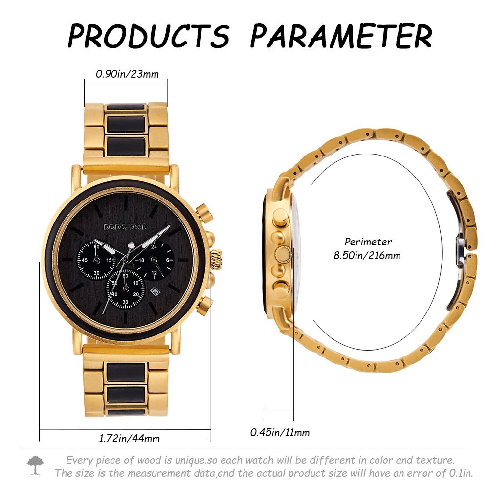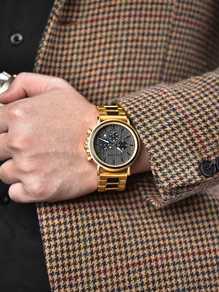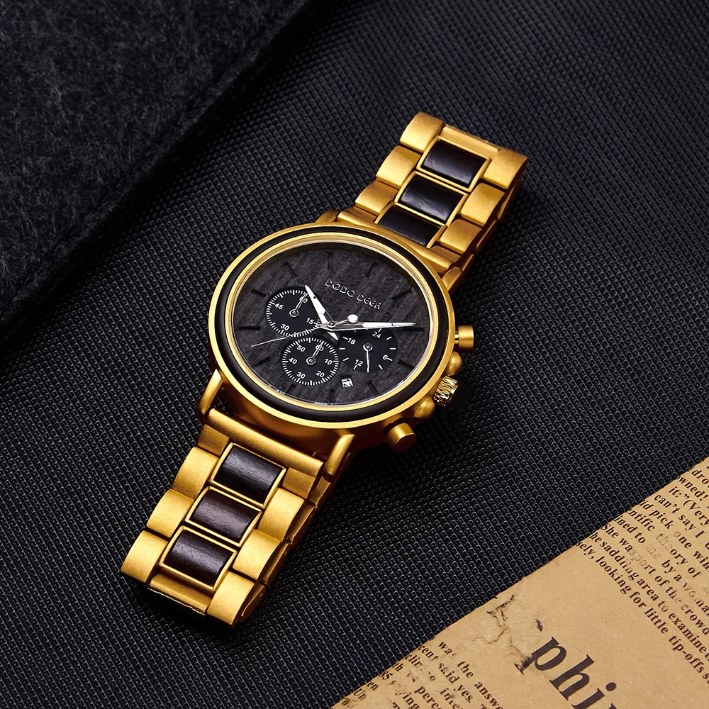 In-Stock USA Red Sandalwood & Gold Alloy Date, Stopwatch, 24H Chronograph Wood Watch with Duty-Free ShippingDesign: A12, Color: Black