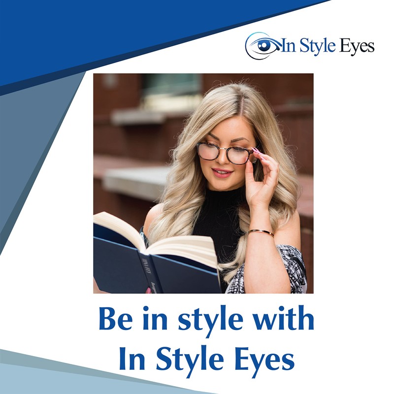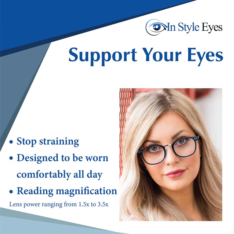 - Be in style with In Style Eyes - Recover your love for reading while being in style. In Style Eyes takes pride in designing high-quality and stylish solutions to common eyesight needs. Reading glasses aren't just for the little old lady set. All frames are designed to keep you looking au courant no matter what your age. If you have macular degeneration or cataracts, a visit to your ophthalmologist can help you determine which magnification is best for you.