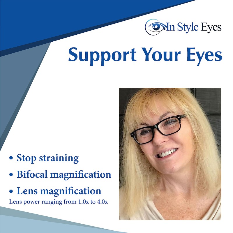 - Be in style with In Style Eyes - Recover your love for reading while being in style. In Style Eyes takes pride in designing high-quality and stylish solutions to common eyesight needs. Reading glasses aren't just for the little old lady set. All frames are designed to keep you looking au courant no matter what your age. If you have macular degeneration or cataracts, a visit to your ophthalmologist can help you determine which magnification is best for you.