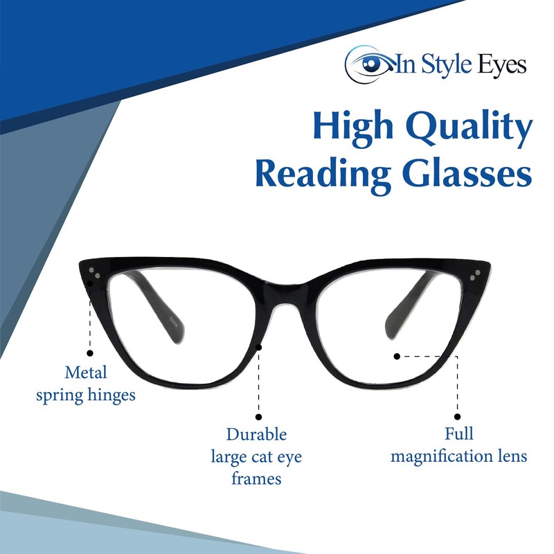 - Stylish reading glasses - With its high-quality retro frames with hinge springs at the temples, In Style Eyes’ stylish large cat eye full readers for women and men unite classic style with everyday functionality at an affordable price.