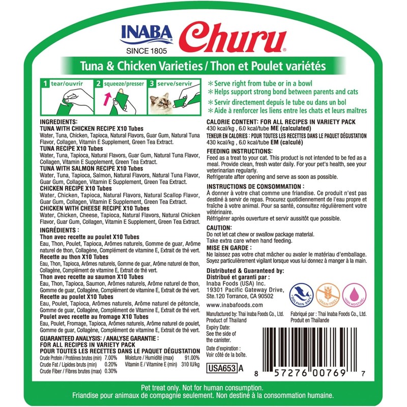 INABA Churu Lickable Cat Treats – Grain-Free, Squeezable Creamy Purée with Vitamin E & Taurine, Tuna & Chicken Flavors, 50 Tubes (0.5 oz Each)