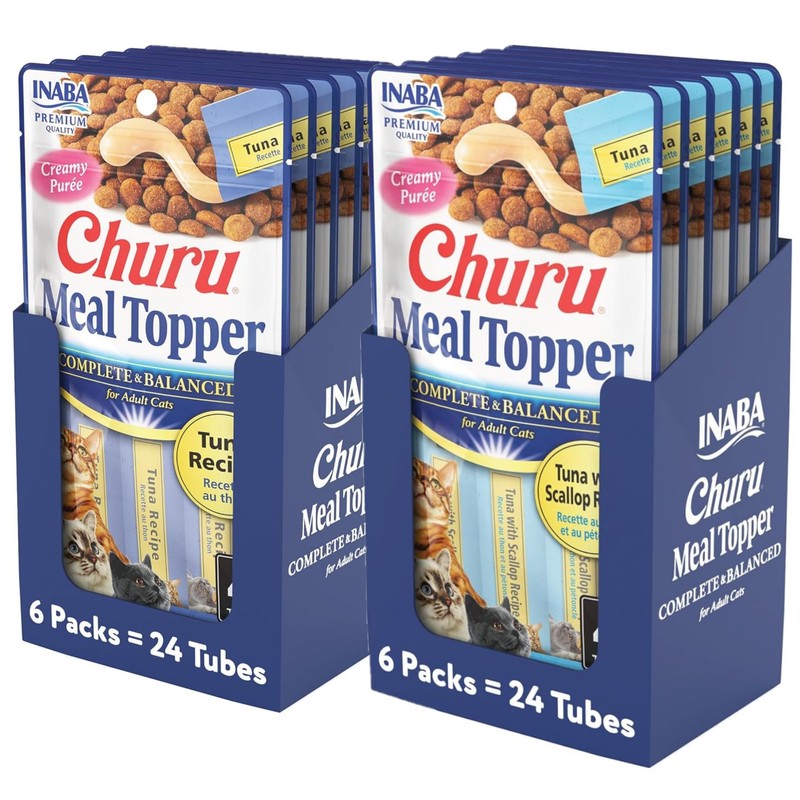 INABA Churu Meal Topper for Cats, Complete & Balanced, Creamy, Lickable Purée Cat Food Topper, 0.5 Ounce Tube, 48 Tubes (4 per Pack), 2 Flavor Variety Pack
