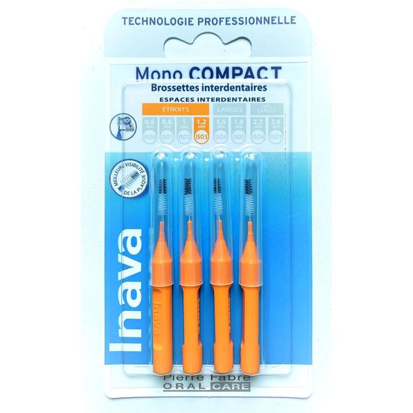 Inava Replacement toothbrush heads 1.2 mm Mono Compact Tight Spaces Orange Pack of 4 allows effective removal in everyday life: plaque causes problems in carrias or gum disease. Food leftovers Thanks to an innovative system, the shaft combines flexibility and resistance so that hard-to-reach areas can be reached.
