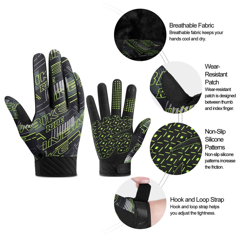 - [Touchsceen & Printing Design]:The index finger is with the touchscreen function,which makes it convenient to use your phone or other touchscreen devices without putting off your gloves.INBIKE bicycle gloves adopts the Heat-transfer Technology to print the brand LOGO,making the cycling gloves stylish and cool.