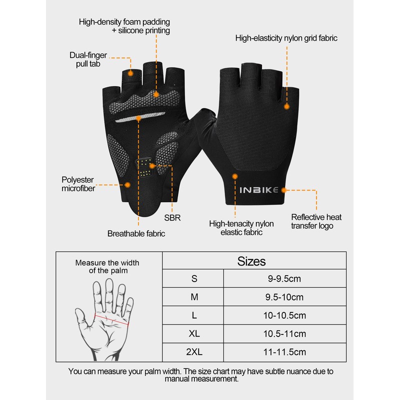 INBIKE Cycling Gloves MTB Gloves Summer Non-Slip Shockproof Half Finger Climbing Gloves SBR Padded Reflective Men Women C221, black, L