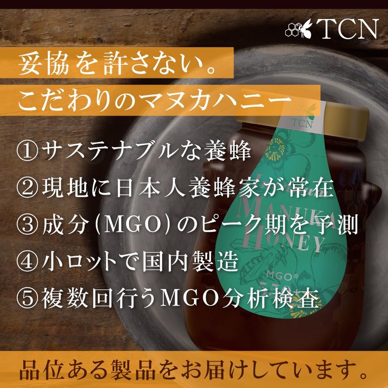 • (Attention to Details) At 1TCN, we have spared our own beekeeping technology and manufacturing methods to ensure that the MGO peaks of Manuka Honey is carefully made to perfection. 2 raw materials, all production, management, and sales are performed by TCN. 3MGO analysis are done multiple times. 4. Original Japanese shading glass jar, unlike plastic material, blocks UV rays and oxygen from passing through, and protects the active ingredients and nutrients of Manuka Honey