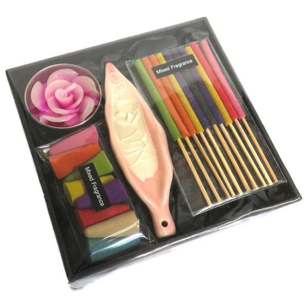 - A small incense gift set, box contains 10 mixed fragrance incense sticks, 8 mixed fragrance incense cones, a flower shaped tealight candle and a crackle glazed ceramic incense stick/cone holder (ash catcher) shaped like a leaf.