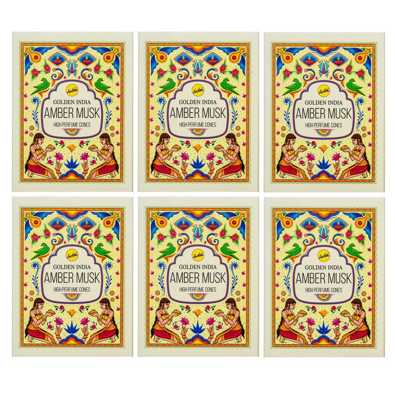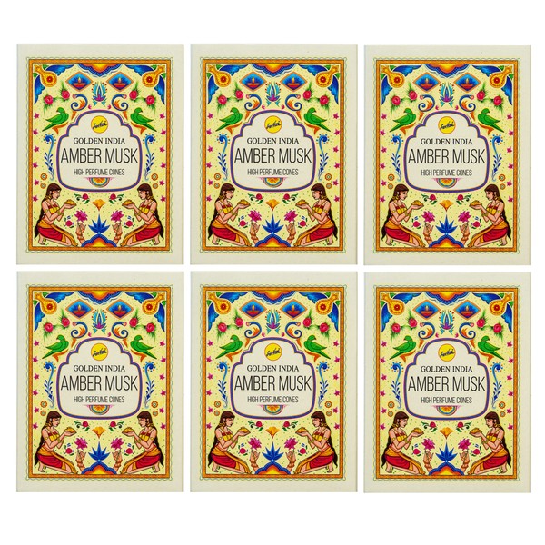 Incense Golden India | High Perfume Back Flow Cones |1 Scent - 6 Packages Amber Musk 10 per Package 60 Total (INFL-GI-AMBERMUSK-6)