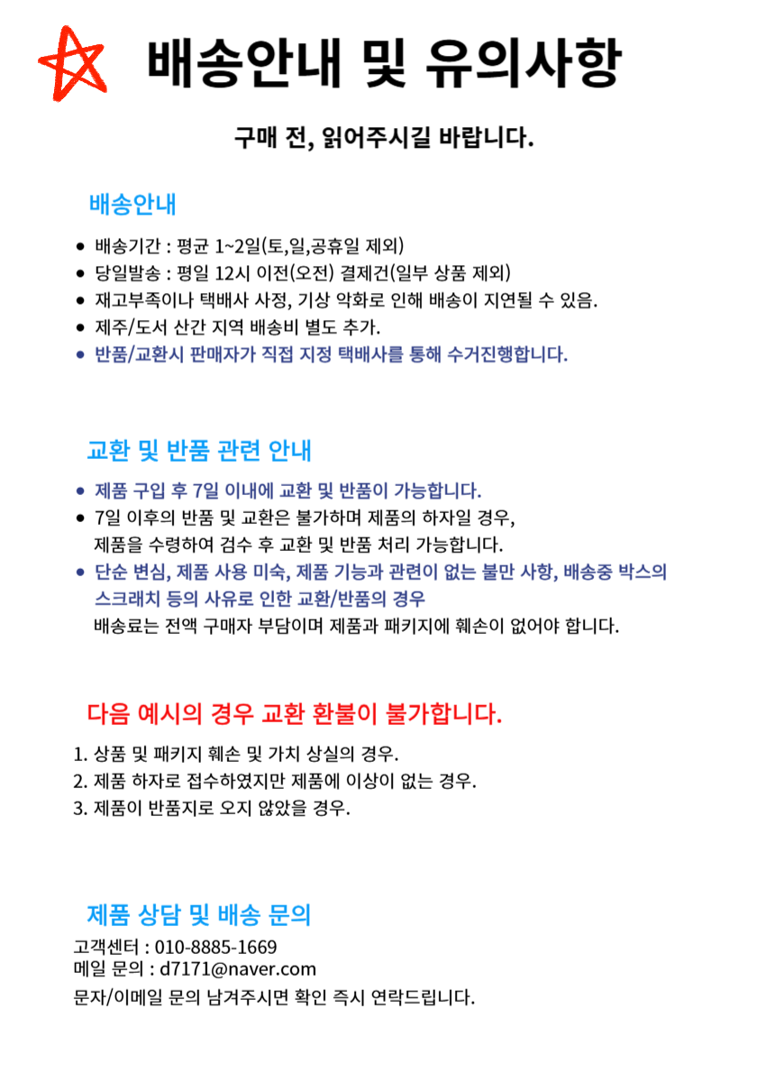 본 제품을 구매하시면 원활한 배송을 위해 꼭 필요한 고객님의 개인정보를 (성함, 주소, 전화번호 등) 택배사 및 제 3업체에서 이용하는 것에 동의하시는 것으로 간주됩니다.