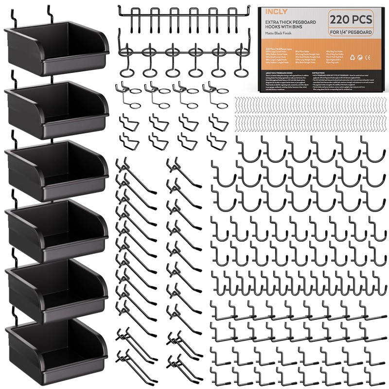 INCLY 220PCS Extra Thick 1/4" Pegboard Accessories Organizer Kit, Heavy Duty Black Pegboard Hooks with Bins and Peg Lock, Peg Board Hooks Assortment for Garage Wall Attachments Hanging Tools