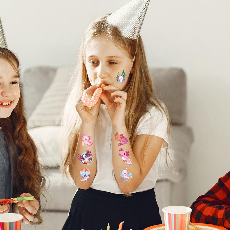 - Axolotl Birthday Party Decoration: These cute tattoo stickers are very suitable for Axolotl themed birthday parties, making the entire venue full of cute little axolotl elements. Tattoo stickers can be used as decorations and distributed to children to stick on their arms, cheeks or backs of their hands. They can also be used as party gifts or prizes and put in gift bags to distribute to each child attending the party