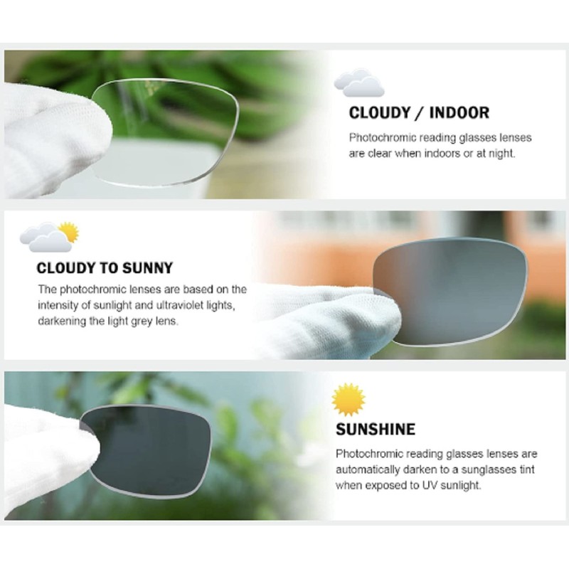 - Photochromic glasses are clear when indoors or at night and automatically darken to a sunglasses tint when exposed to UV sunlight (may not change obviously under weak UV lights). Lenses will begin to clear as soon as they are away from UV sunlight, and will be noticeably lighter and mostly clear within a few minutes. They absorb UV radiation that can otherwise damage your eyes. They are an excellent solution for people who hate constantly switching between their reading glasses and their shades.