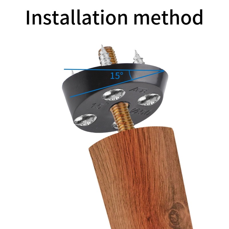 - 15 degree inclination: The leg mounting plate adopts a 15 degree inclination design, specifically used to fix the legs on various new or damaged furniture, to repair and reinforce furniture, and prevent it from swinging. The installation board of the furniture legs is inclined at a 15 degree angle, so there is no need to cut the chair wood into 15 degrees during installation to install the installation board.