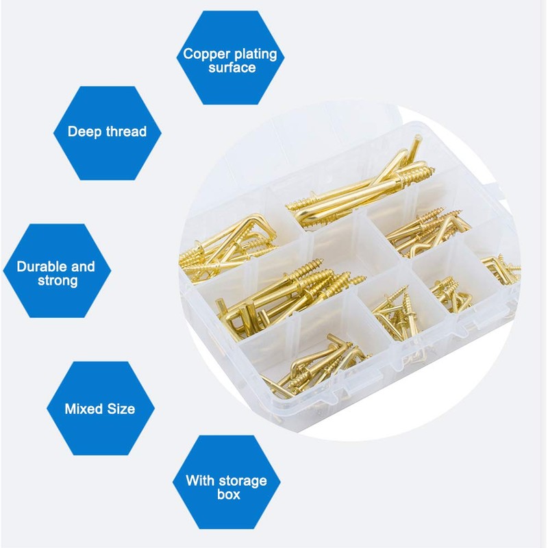 INCREWAY -Screw Hooks, 170 Pieces, 8 Sizes, Gold Brass Plated Metal Self Tapping Screws, Curved Hooks, L Hooks, Right Angle Hooks for Hanging Small Items