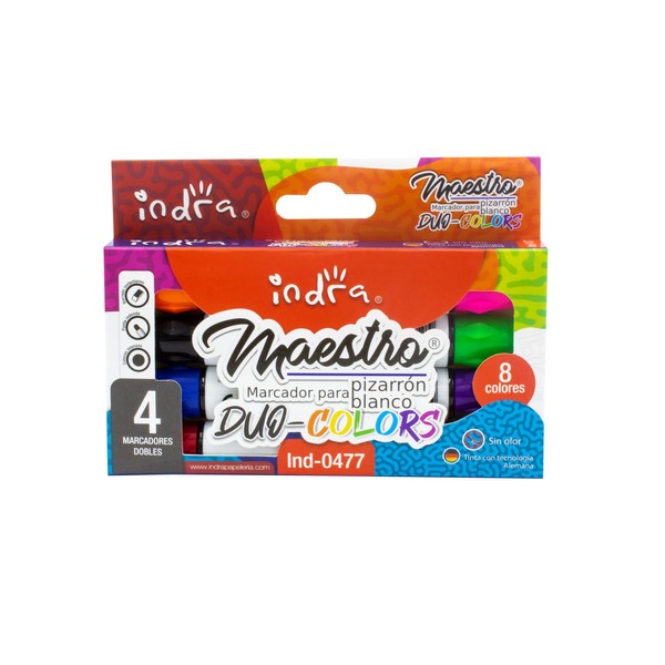 Set de 4 marcadores para pizarrón blanco con doble punta, colores intensos rojo, verde, naranja, azul marino, morado, rosa, amarillo y negro. Úsalos sobre cristal y pizarrones blancos. Punta bala.