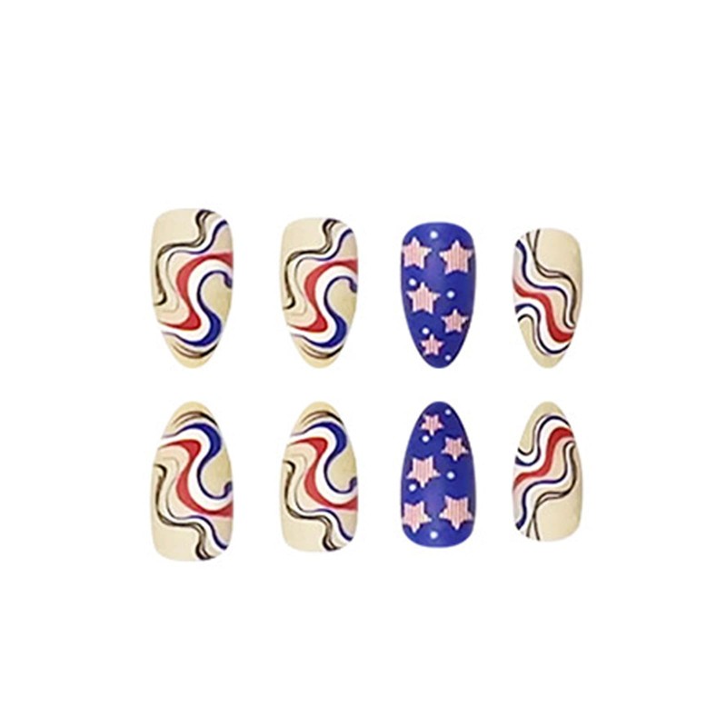 Independence Day Fake Nails Almond Press on Nails Medium False Nails with Star and Blue Red White Wave Designs 4th of July Press on Nails Patriotic Glue on Nails Full Cover Matte Stick on Nails 24Pcs