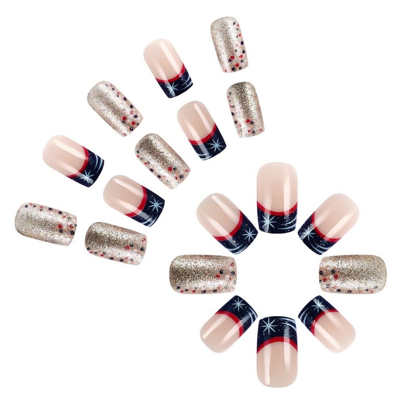 - Package: You'll get 24 pieces Independence Day press on nails,1 mini nail file, 1 small wooden stick, 24 grain jelly glue. You can safely choose a fake nail that fits your finger size and DIY your desired nail shape