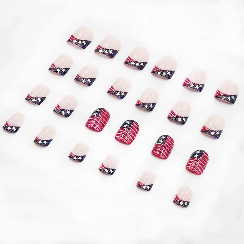 - Package: You'll get 24 french short square false nails in 12 sizes. 1 mini nail file, 1 small wooden stick, 1 piece of nail glue sticker. Independence Day glue on nails are perfect for most people's nails