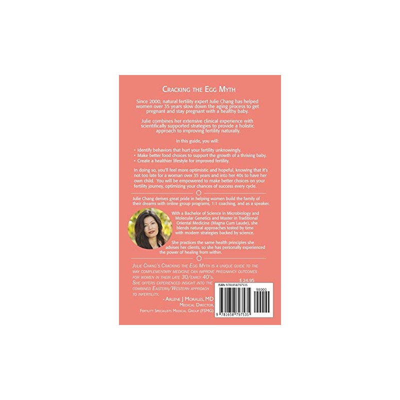 Do any of these situations apply to you?*You're over 35 years of age and trying to get pregnant.*You've been told that you're too old to get pregnant with your own eggs.*You've had pregnancy losses.*You're preparing for IVF.Since 2000, natural fertility expert Julie Chang has helped women over 35 years halt the aging process to get pregnant and stay pregnant with a healthy baby. Julie combines her extensive clinical experience with scientifically supported strategies to provide a holistic approach to improving fertility naturally.In this guide, you will:- Identify behaviors that hurt your fertility unknowingly.- Make better food choices to support the growth of a thriving baby.- Create a healthier lifestyle for improved fertility.In doing so, you'll feel more optimistic and hopeful, knowing that it's not too late for a woman over 35 years and into her 40s to have her own child. You will be empowered to make better choices on your fertility journey, optimizing your chances of success every cycle."Julie Chang's Cracking the Egg Myth is a unique guide to the way complementary medicine can improve pregnancy outcomes for women in their late 30/early 40's. She offers experienced insight into the combined Eastern/Western approach to infertility." - Arlene J Morales, MD, Medical Director, Fertility Specialists Medical Group (FSMG)
