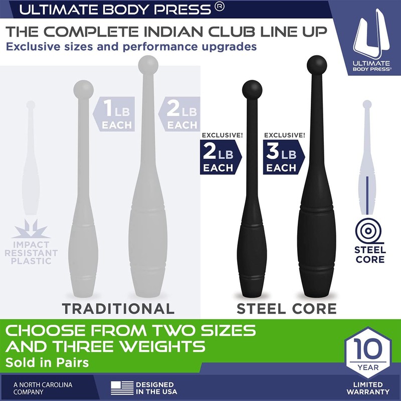 - Includes: Pair of 2lb Steel Core Indian Clubs. The exclusive new Steel Core Indian Clubs from Ultimate Body Press set a new standard. Upgrade to the high performance club with steel core inserts for increased resistance with improved maneuverability