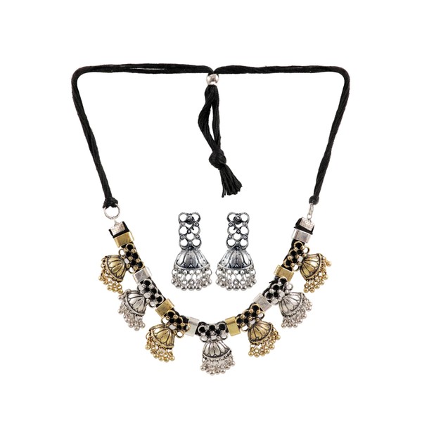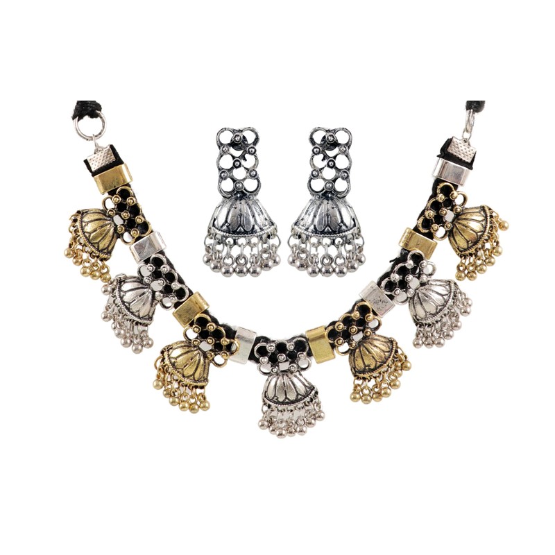 Indian Designer Statement Afghani Silver Oxidised Dual Tone Ethnic Traditional Tassel Choker Necklace Jewelry Women (Silver Gold)