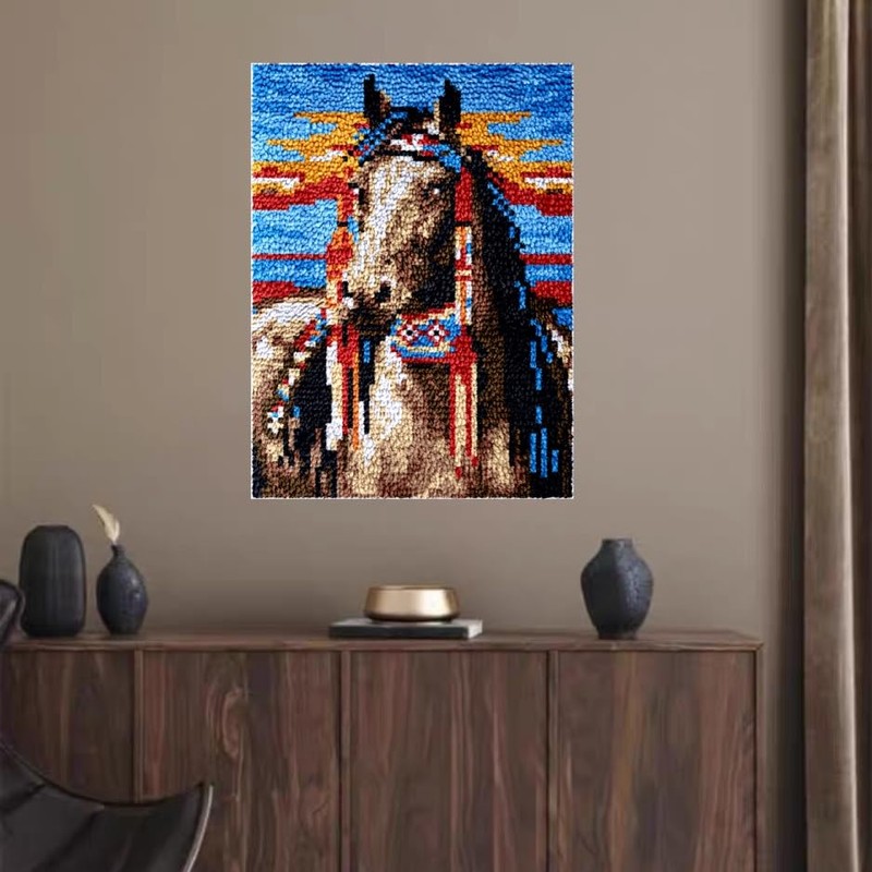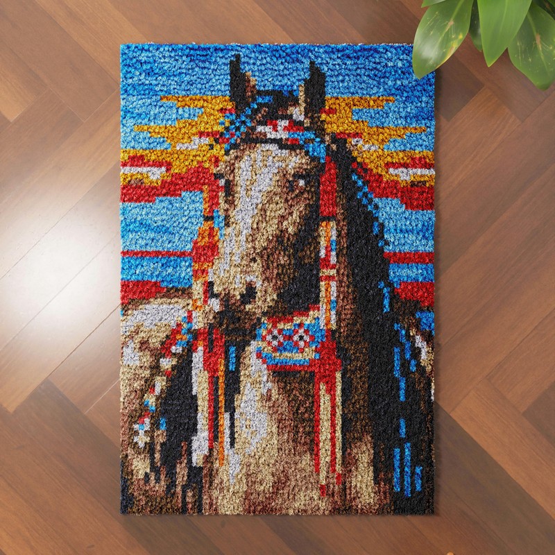 Indian Horse Latch Hook Rug Kit for Adults Easy Carpet Cushion with Printed Canvas Crochet Yarn Craft DIY Hooking Tapestry for Home Floor Decoration Pets Pads 52x38cm(1)