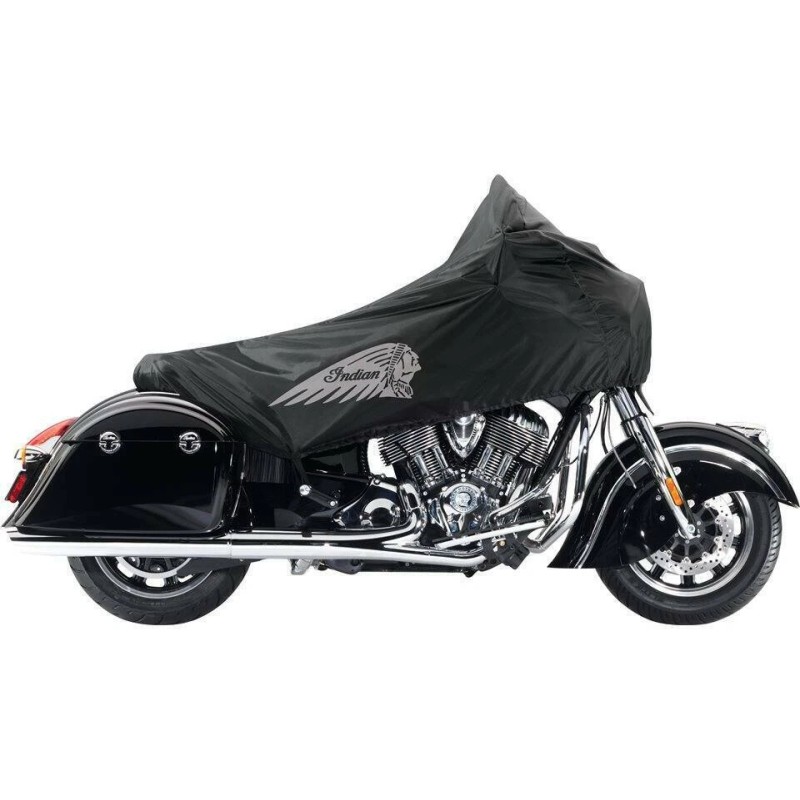 Keep your Indian® Chieftain® clean, protected and looking great between rides with this Travel Cover. This cover extends over the Indian® Chieftain® fairing, windshield, fuel tank and leather seat to provide reliable protection for the most high-profile areas of your beautiful motorcycle. It covers and protects so your bike remains clean and ready for riding. This cover goes on and off the bike easily, so you’ll use it after every ride. It also packs into its own convenient storage bag for easy transport in a saddlebag.