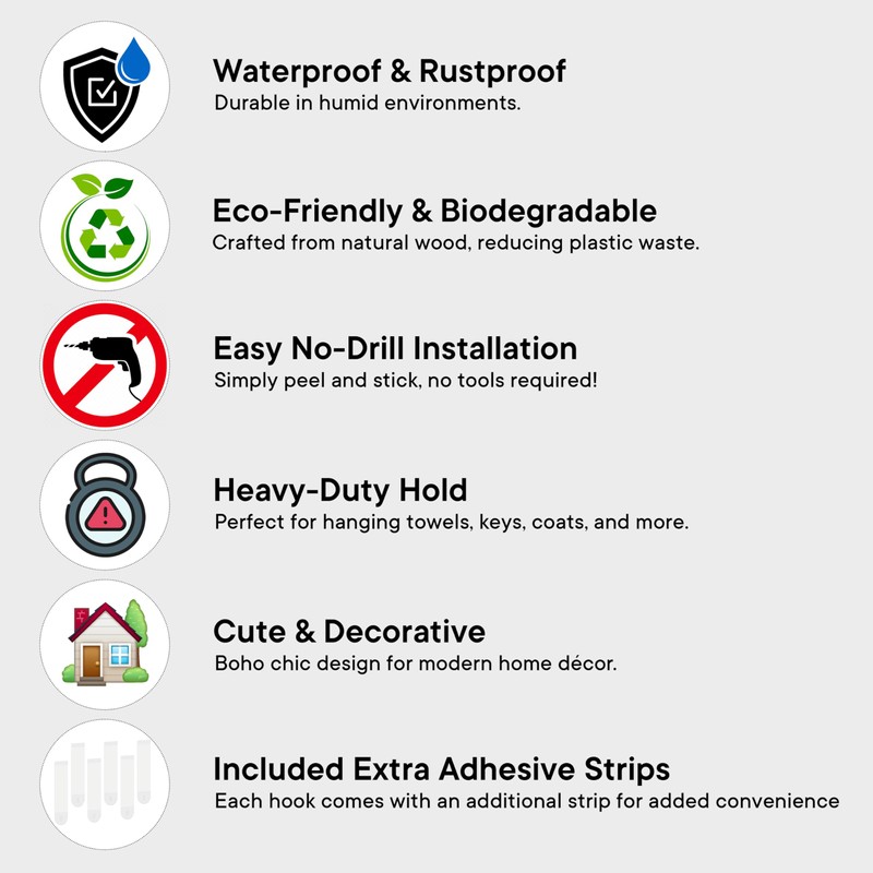 - Unique Design- The Eye-Catching Self Adhesive Hooks with a Handmade Wooden Boho Design are Perfect for Bringing Attention to Detail to the Living Room, Bedrooms, Kitchen and Bathroom.