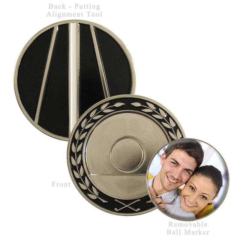 PERSONALIZED Jumbo Pocket Marker--2 ball marker in one unit. Size 1.50" diameter. Nickel-plated jumbo pocket marker with removable 1.00" diameter die struck nickel plated PHOTO PERSONALIZED ball marker. The ball marker on the obverse with putting alignment guide on the reverse. Packaged in clear vinyl gift sleeve.