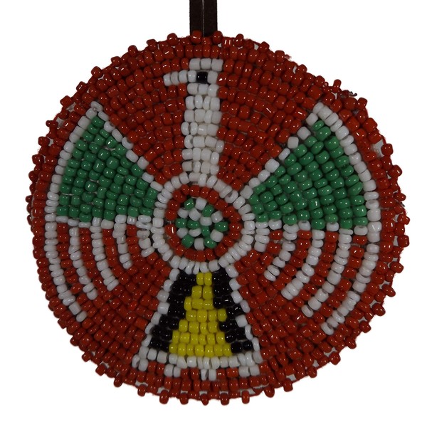 Indigenous Style Seed Bead Eagle Red Rosette Christmas Tree Ornament. Made from Glass Seed Beads and Vinyl. Approximately 5 x 3 Inches. Hanger Included. Items are unique, appearance may vary slightly from item pictured. Made in India.