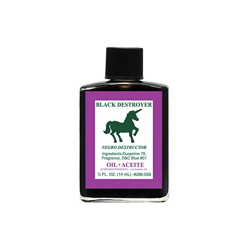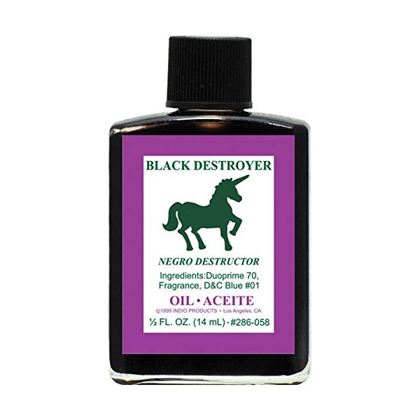 1/2 fl. oz. (14.7ml) Use Indio Black Destroyer Fragranced Spiritual Oil to help destroy spells jealousy bad luck fear evil eye and curse. Oils can be used to dressed candles it could be use in the body and or to make any kind of rituals. *