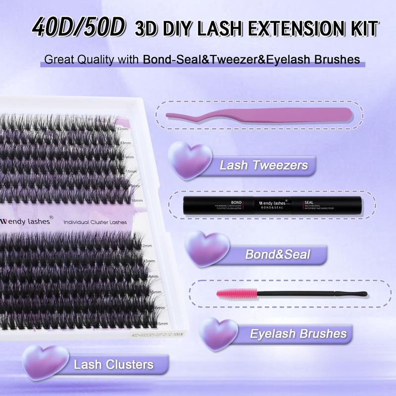 - 【Match it Freely】This eyelash extension kit contains everything you need to get eyelash extensions in the salon. Wendy individual cluster lashes have two styles and mixed with five lengths 12-16mm, cluster lash bond&seal, cluster eyelash applicator and lash brush, mixed length: 12mm 13mm 14mm 15mm 16mm.you can choose the length that suits your DIY lash extensions in one lash tray.