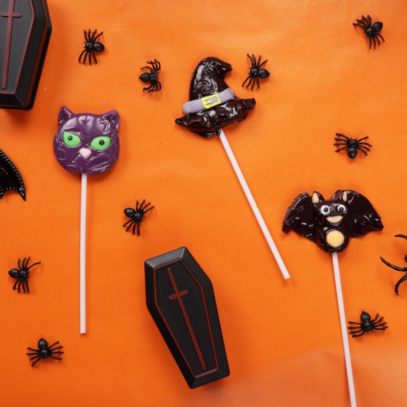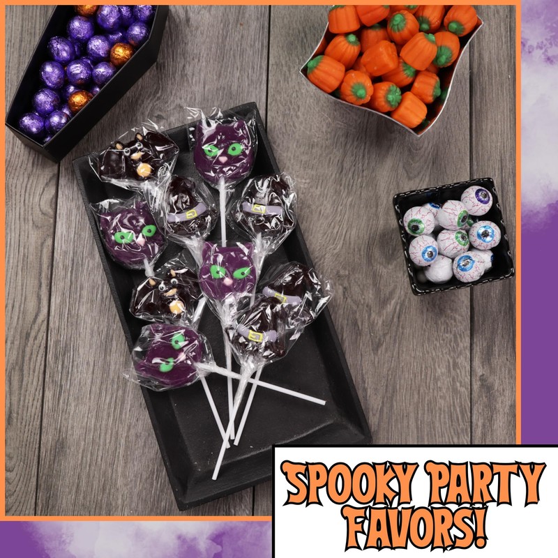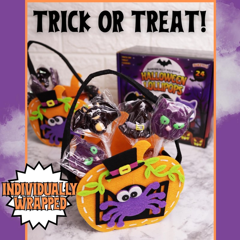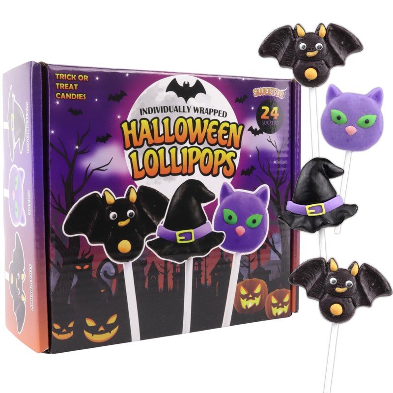 - Includes 24 Halloween suckers with cat, bat, and witch hat designs
