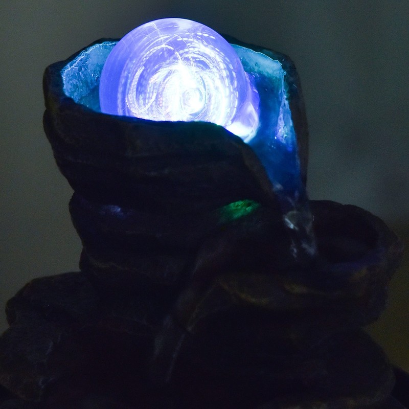 - LED lighting and glass ball: the water flow leads to the glass ball in an infinite rotation, illuminated by LED lighting with colour variations for a satisfactory and mesmerising rendering. A decorative object that radiates zenality