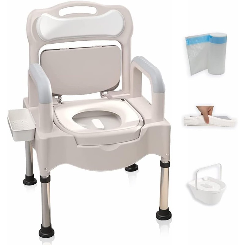 INDPOOOR Multifunctional Portable Adult Toilet Chair The Bedside Commode Chair offers portability, privacy, and independence for people. With high-strength steel pipe legs, padded plastic seat and backrest, detachable bucket, tissue box, and 4 non-slip feet, our toilet chairs are designed to improve quality of life for people with mobility limitations.Features: Suitable for a variety of occasions, height adjustable, barrel design, wear pad.Suitable for the venue: Bathroom, bedroom, living room, toilet, etc.Suitable for the crowd: The elderly, pregnant women, the disabled, and people who have difficulty walking.Packing list Bedside toilet X1commode liners X20trash bag X20.