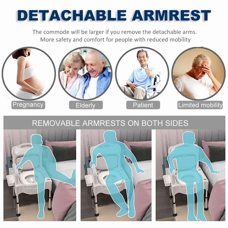 - Comfortable and SoftThis portable toilet for adults using PU cushioned toilet seat and PU cushioned backrest chair, the toilet on both sides of the armrests and heightened seat back to form an encircling, increasing the sense of security, Ergonomically designed and to give more comfortable support, great for pregnant women and the elderly.