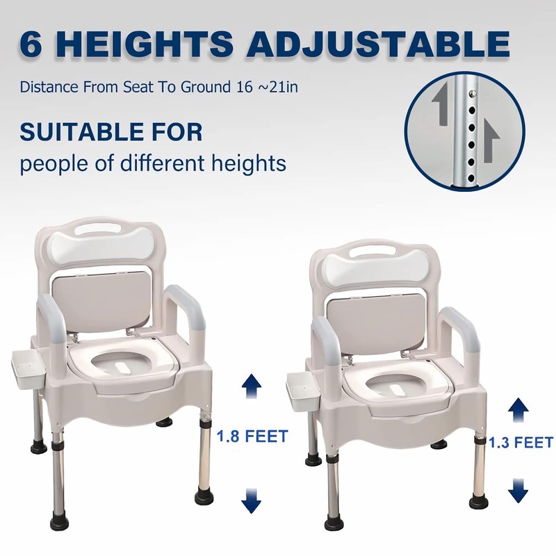 - Portable and AdjustableThis mobile toilet weighs only 12 pounds, making it small and easy to move in the house and outside, placed at night on the bedside, more convenient and fast night toilet, This bedside toilet raiser or lower the seat height without tools, Locking push-buttons make it easy to adjust to the perfect height from 16" - 21" for different user height.