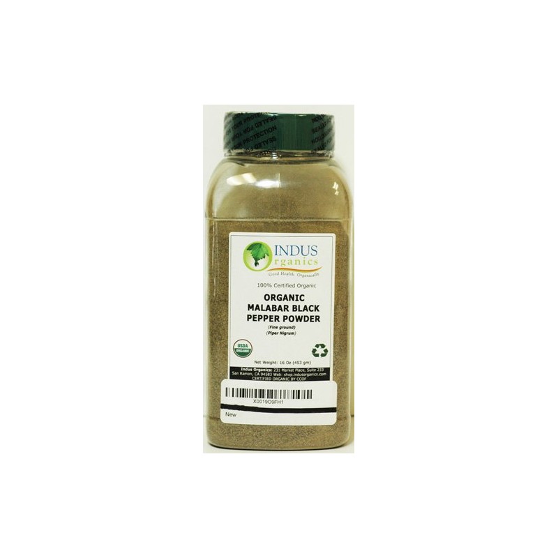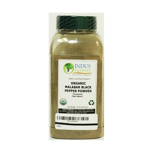 Indus Organics Malabar Black Pepper Powder (Fine Ground), 1 Lb Jar, Premium Grade, High Purity, Freshly Packed