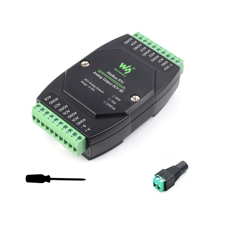 Industrial 8-Ch Analog Output Module 12-bit DA Conversion DC 7~36V Wide Voltage Power Supply, Sending Modbus RTU Protocol Commands via RS485, 8-CH Voltage Output