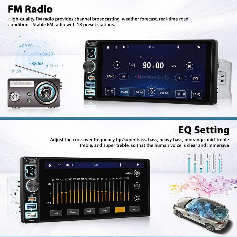 - Bluetooth & FM Radio: Car audio receiver with bluetooth 5.2 supports hands-free calling, phone book download and music playback. The built-in or external microphone picks up your voice, and your car speaker lets you hear the person on the other side. With 18 preset stations, stable high-quality FM radio provides channel broadcasting, weather forecast, real-time road conditions