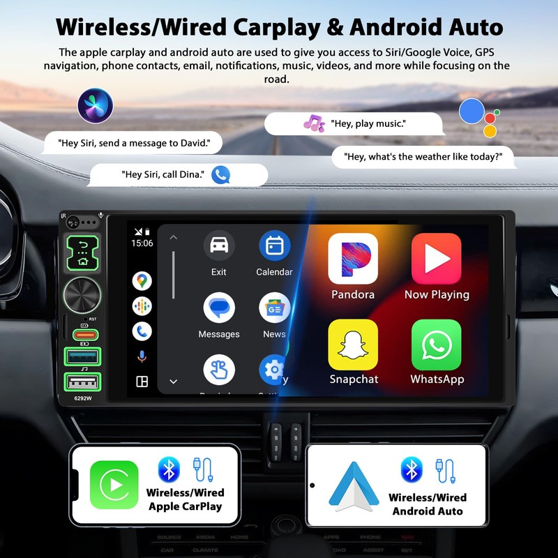 - Wireless CarPlay & Android Auto: Wireless connection for voice-assisted controls and easier access to your phone's music, navigation, calls, messages and more. For Samsung, some cannot use Android Auto and Mirror Link; For Huawei, some cannot use Android Auto