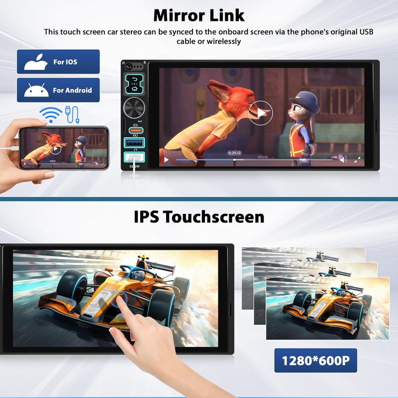 - Mirror Link for Android / iOS: This 1 din touch screen car stereo can synchronize the contents of your phone screen to the onboard screen. Open the navigation app on your phone and you will be able to use the navigation functions in your car while driving