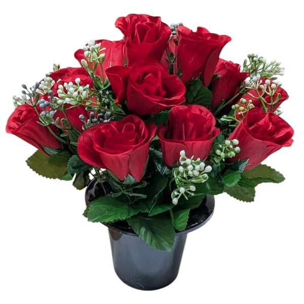 - Artificial red rose flower arrangement with included grave pot insert