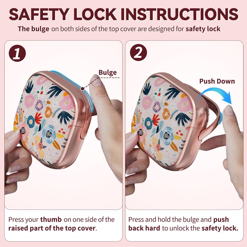 - 【SafetyLock Design】: Upgraded top cover lockable function can firmly fix the upper of the case, which make the top cover connected to the bottom always, When the buckle is fixed upward on the top cover, it will lock the earphone charging case and effectively prevent the earphone from falling out. The earphone can be opened only when the buckle is removed from the top cover