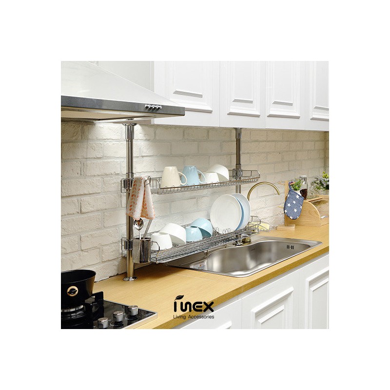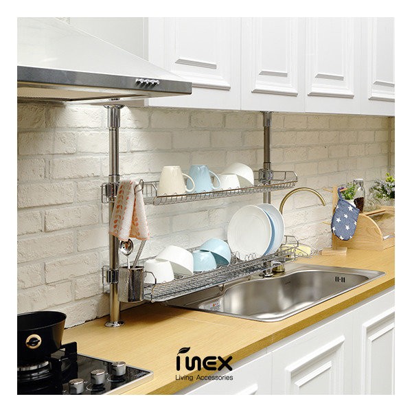 - Components: 2 shelves (1 integrated plate rack shelf, 1 regular shelf), 2 each main pillar/auxiliary pillar/upper cap/lower cap, 4 each fixing clamp/bushing, 1 each dishtowel holder/scrub rack/spoonware container