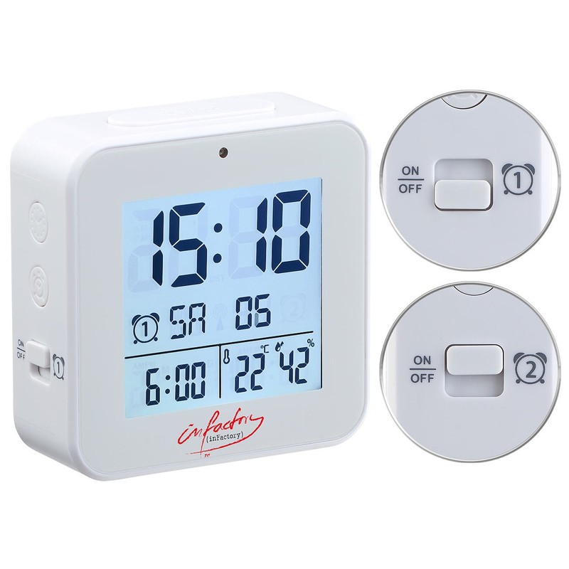 infactory Funk Reisewecker: Funk-Wecker mit 2 Weckzeiten, Thermo-Hygrometer, Lichtsensor, weiß (Wecker mit Zwei Weckzeiten, Wecker Digital, Beleuchtete Uhr)