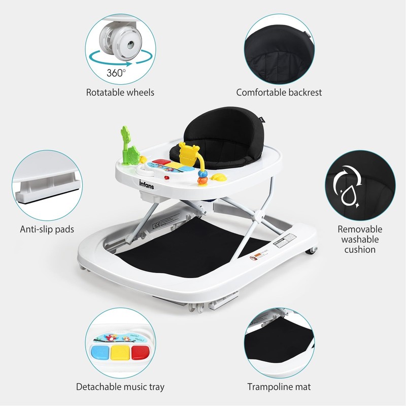 INFANS Foldable Baby Walker, 3 in 1 Toddler Walker Bouncer, Learning-Seated, Walk-Behind, Music, Adjustable Height, High Back Padded Seat, Detachable Trampoline Mat, Activity Walker with Toys (Black)