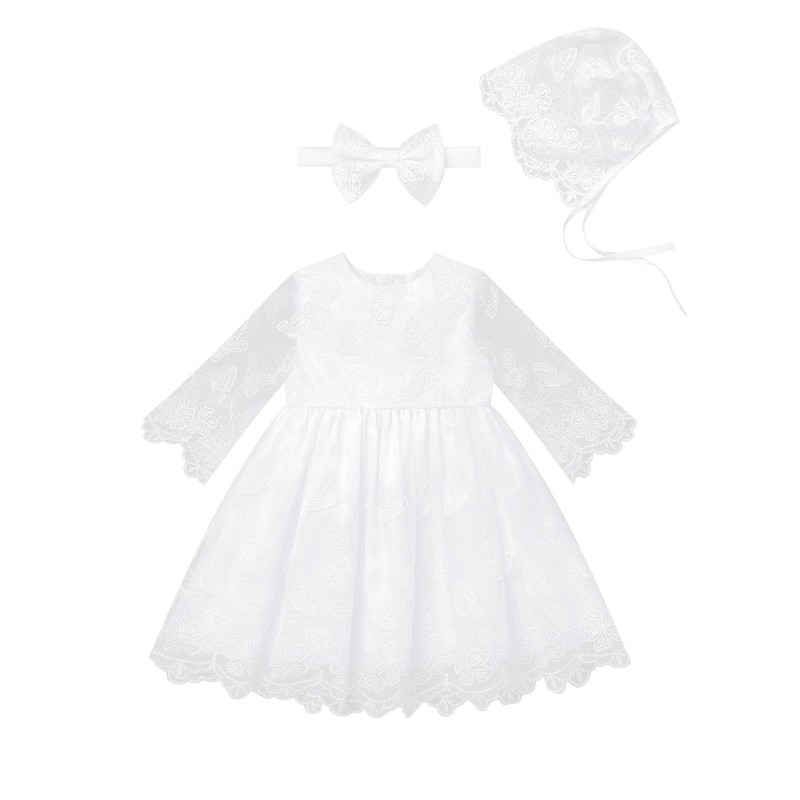 - White Baby Girl Dress: Delicate and darling, this white lace dress is made with a detailed flower and butterfly embroidered netting lace in light ivory for a classic and vintage style. A sweet sheer long sleeve is the perfect accent to the styling of this dress!
